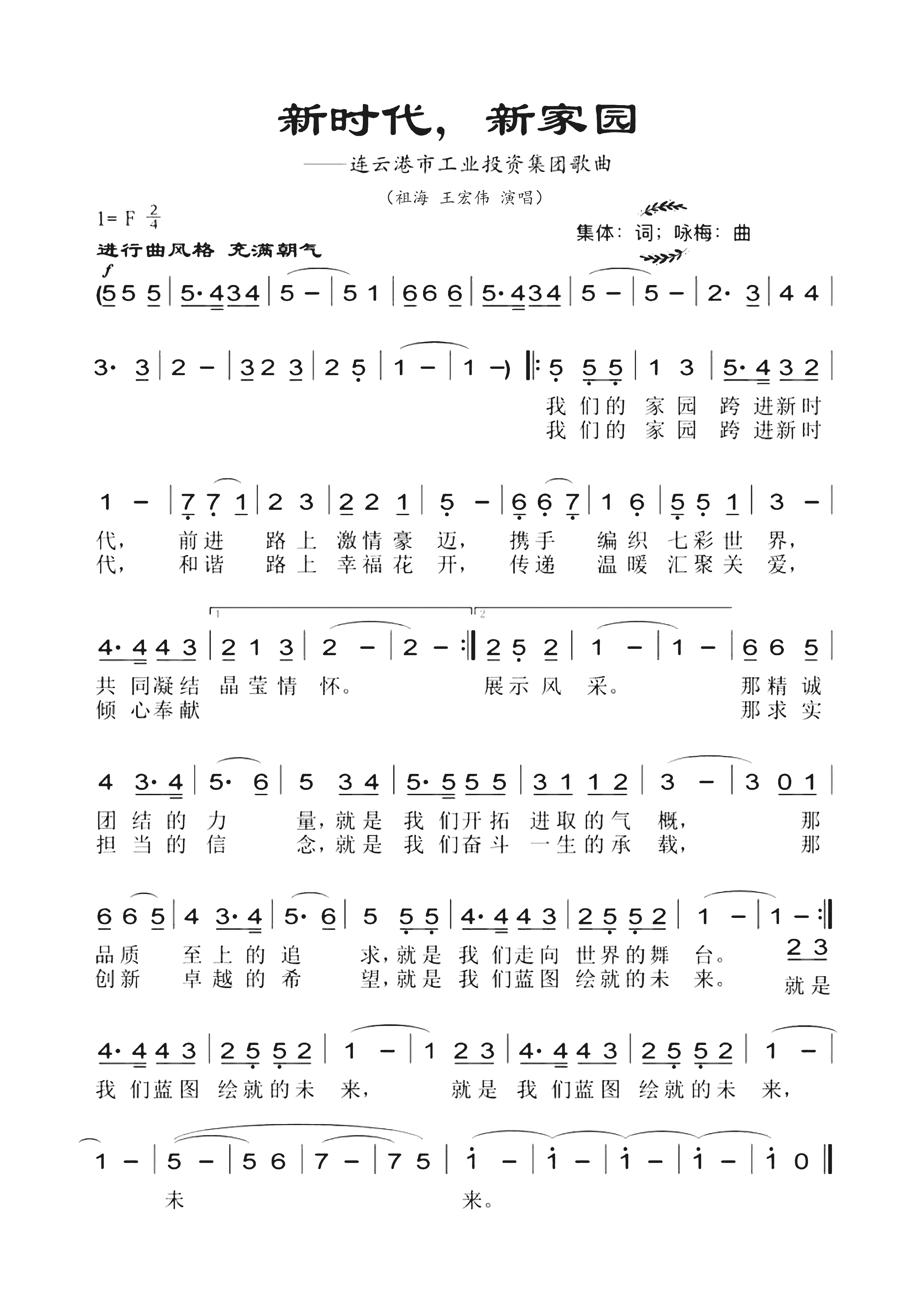集團(tuán)公司企業(yè)歌曲《新時(shí)代,新家園》由我國著名作曲家王詠梅作曲,我國著名歌唱家祖海、王宏偉演唱,亞洲愛樂樂團(tuán)演奏,愛樂樂團(tuán)藝術(shù)總監(jiān)、首席指揮黃立杰指揮。