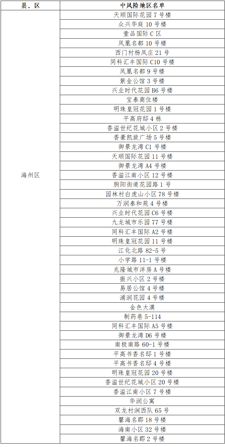 根據(jù)國(guó)務(wù)院聯(lián)防聯(lián)控機(jī)制有關(guān)規(guī)定,經(jīng)市指揮部研究決定,自發(fā)布之日起,對(duì)我市部分區(qū)域疫情風(fēng)險(xiǎn)等級(jí)進(jìn)行調(diào)整:海州區(qū)中央華府D1棟、玉蘭國(guó)際5號(hào)樓、福園名邸3號(hào)樓、一品苑44號(hào)樓、博威江南明珠苑33號(hào)樓、如佳賓館(霞輝路店)、鳳祥銘居7號(hào)樓、蒼梧春曉23號(hào)樓、龍河小區(qū)25號(hào)樓、鷹游水岸花園5號(hào)樓、海南小區(qū)34號(hào)樓、仕方國(guó)際9號(hào)樓、茗馨花園18號(hào)樓、梧桐藍(lán)山晴園7號(hào)樓、富強(qiáng)路疏導(dǎo)點(diǎn)旁三合院、百達(dá)菲力酒吧、通灌南路66號(hào)3棟、極美公寓4號(hào)樓、路南街道河運(yùn)路35號(hào)樓、海連中路151號(hào)、興城四號(hào)公寓8號(hào)樓、青年路55號(hào)5棟、東方領(lǐng)秀7號(hào)樓、寶翔財(cái)富廣場(chǎng)3號(hào)樓、園林村白虎山組王莊隊(duì)13號(hào)、津華苑小區(qū)A2號(hào)樓、盛世豪庭小區(qū)8號(hào)樓、許莊村楊圩北隊(duì)51號(hào)、振興公寓6號(hào)樓、建欣路1號(hào)樓、園林村白虎山小區(qū)100號(hào)、路南街道東村巷2號(hào)樓、建設(shè)中路76-24號(hào)由中風(fēng)險(xiǎn)地區(qū)調(diào)整為低風(fēng)險(xiǎn)地區(qū)。
