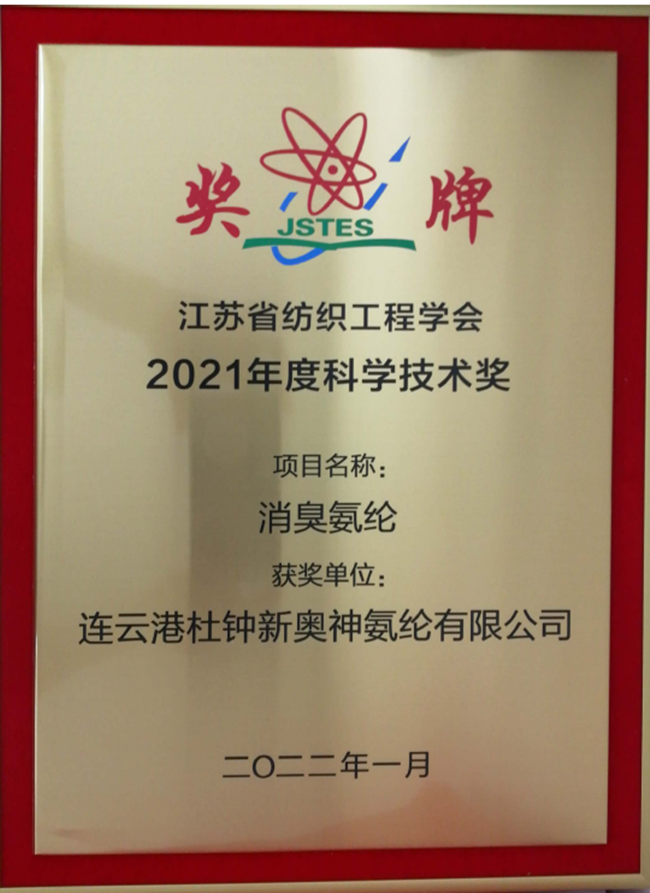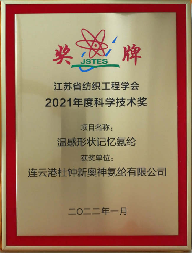日前,杜鐘氨綸公司2021年申請(qǐng)參評(píng)的兩項(xiàng)自主研發(fā)新產(chǎn)品《溫感形狀記憶氨綸》、《消臭氨綸》被授予江蘇省紡織工程學(xué)會(huì)2021年度科學(xué)技術(shù)獎(jiǎng)。