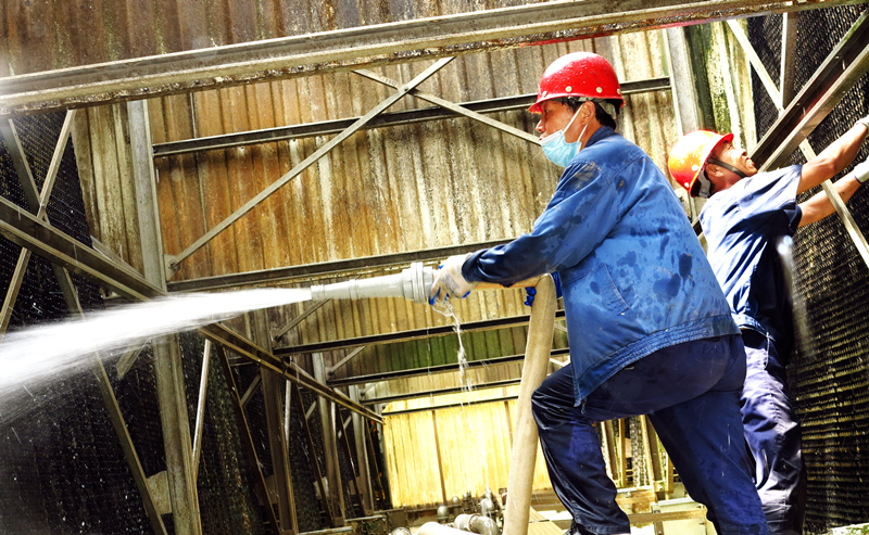 近期,最高氣溫達到了36℃!公用工程部一直密切關(guān)注近一周的天氣預報,利用連續(xù)高溫天氣回調(diào)之際,迅速組織相關(guān)清洗人員,利用一天時間緊急清洗八期冷卻塔,將附著在填料上藻狀和絮狀物及塔底淤泥等徹底清理干凈,從而保證冷卻塔通風量,使八期動力設(shè)備得以在高溫環(huán)境下安全運行,接受“烤驗”。