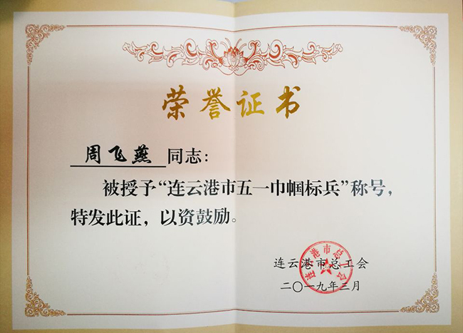 熱烈祝賀我公司市場開發部周飛燕同志被連云港市總工會授予“連云港市五一巾幗標兵”榮譽稱號。