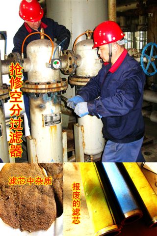 他們中間既有“技能大師”、市級(jí)“五一勞動(dòng)獎(jiǎng)?wù)?rdquo;獲得者設(shè)備“醫(yī)學(xué)專家”—伏彩兵,也有不見(jiàn)經(jīng)傳的普通一線維修員工。近期,公用工程部人員發(fā)現(xiàn)1#空分制氮機(jī)組氣壓降低1個(gè)表壓,能耗上升,氮?dú)饧兌群彤a(chǎn)氣量雙降,有報(bào)警停車隱患,經(jīng)維修和自主維修“醫(yī)生”緊急會(huì)診,診斷為“芯梗”,需要立即“換芯”(更換空氣過(guò)濾器濾芯),面對(duì)突發(fā)情況,為保證生產(chǎn)安全運(yùn)行,維修人員自覺(jué)加快維修進(jìn)度,加班加點(diǎn)開(kāi)展濾筒解體,吊裝,換芯,復(fù)位等工作,提前兩小時(shí)完成搶修任務(wù),原“芯梗”制氮機(jī)組進(jìn)氣運(yùn)行后壓力恢復(fù)正常,隱患解除。