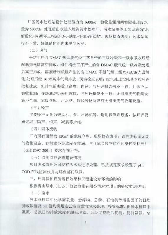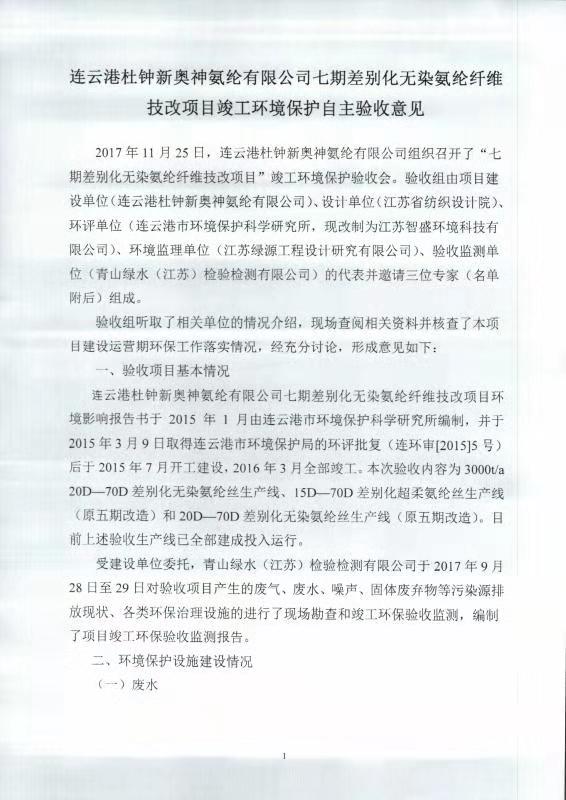 七期差別化無染氨綸纖維技改項目竣工環(huán)境保護自主驗收意見