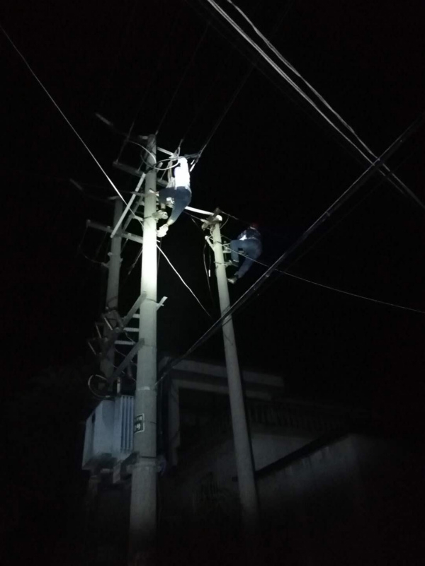 8月5日晚,接到報修電話的值班人員,帶好隨身工具立即到達黃沙一隊查看情況。借著手電發現一組引線已經燒毀。正值天氣炎熱,為了保證居民正常用電,值班人員一邊安撫居民,一邊聯系值班領導說明情況。值班人員回到所里立即準備搶修材料,值班領導聯系家住在附近的員工前來支援搶修工作。經過近一個半時的奮戰,恢復了居民的用電。看見家家戶戶亮起了燈光,渾身濕透的搶修人員才舒了一口氣。( 盧正遷)