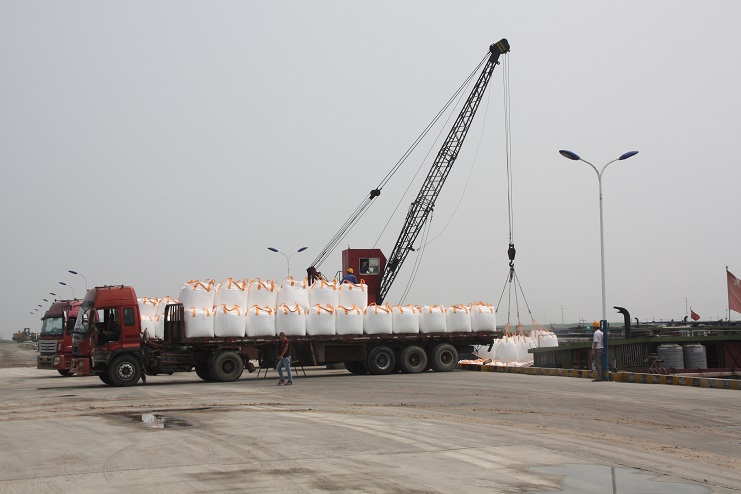 據了解,在國慶長假期間,該公司對各項工作做了充分的準備,加強節日期間碼頭正常運營管理,對碼頭工人進行了排班,對吊裝設備、裝卸人員進行細致的安排部署,確保了國慶長假生產經營不停息。雨日過后,從3日開始,五灌河碼頭就是一派車水馬龍景象,只見一輛輛滿載噸袋的運輸卡車整齊的停放在路邊,一艘艘貨船在泊位上靜靜停泊等待,兩臺吊車正在進行著噸袋吊裝,掛鉤、移動、解鉤,車上船艙內工人密切配合,動作熟練,將潔白的噸袋穩穩地裝船,每天吊裝噸袋30多車。在不遠處的自卸碼頭,一輛輛運鹽車輛,通過卸鹽滑板,直接將滿車斗的鹽倒入船艙,僅兩三天就裝鹽2000余噸。(季興勝)