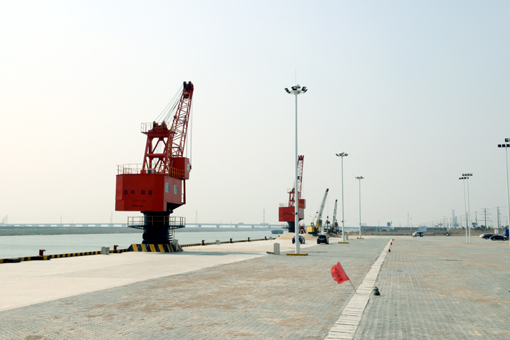 在五灌河碼頭現(xiàn)場,302米長的碼頭平臺上,2座20多米高的紅色座吊一字排開,在河水的映照下顯得格外“威武”。據(jù)碼頭工作人員介紹,這兩座吊機剛剛安裝并調(diào)試完畢,它們是五灌河碼頭運營的最基本條件之一,一座25噸,另一座40噸,運出貨物將通過這兩座吊機完成。