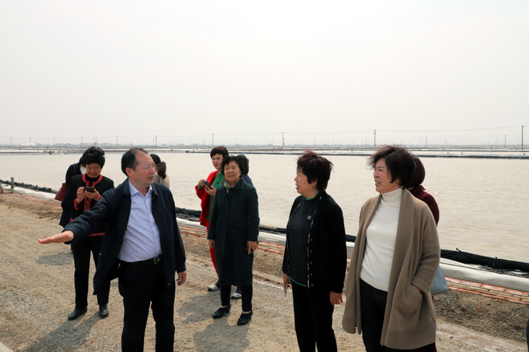 在日曬制鹽生產一線,新式的帶鹵扒鹽機械在鹽田里工作著,女企業家們走上格堰灘頭,用手中的手機記錄下帶鹵扒鹽的生產場景。李國文就原鹽生產情況向女企業家們介紹:現在看到的是日曬制鹽公司春扒現場,結晶池里的是T30扒鹽機,通過鹽泵把結晶池里的原鹽輸送到對面的廩基中。