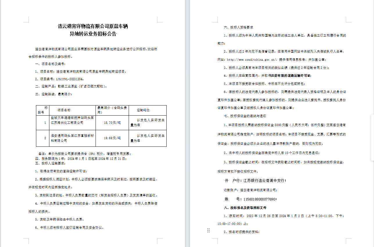連云港宵洋物流有限公司原鹽車輛異地轉運業(yè)務招標公告