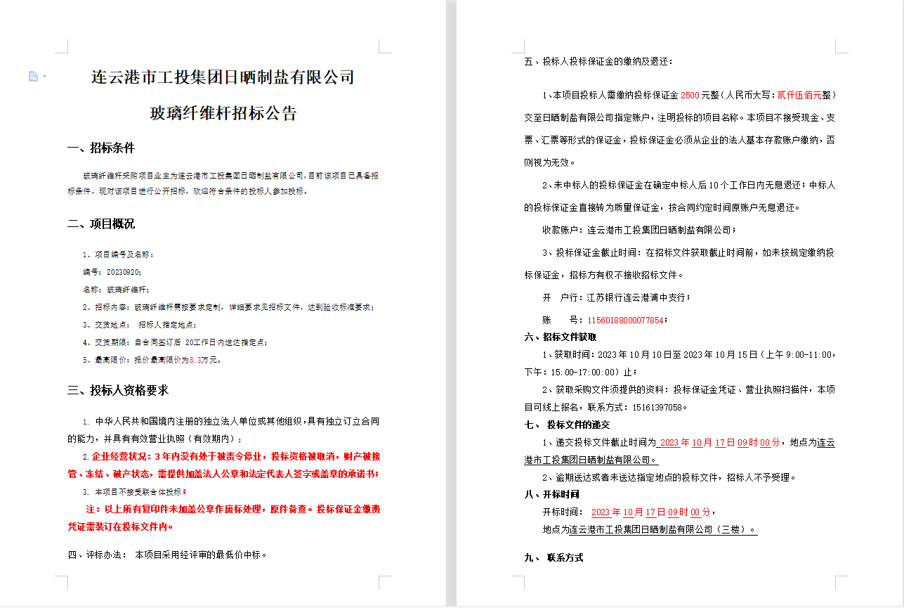 連云港市工投集團(tuán)日曬制鹽有限公司 玻璃纖維桿招標(biāo)公告