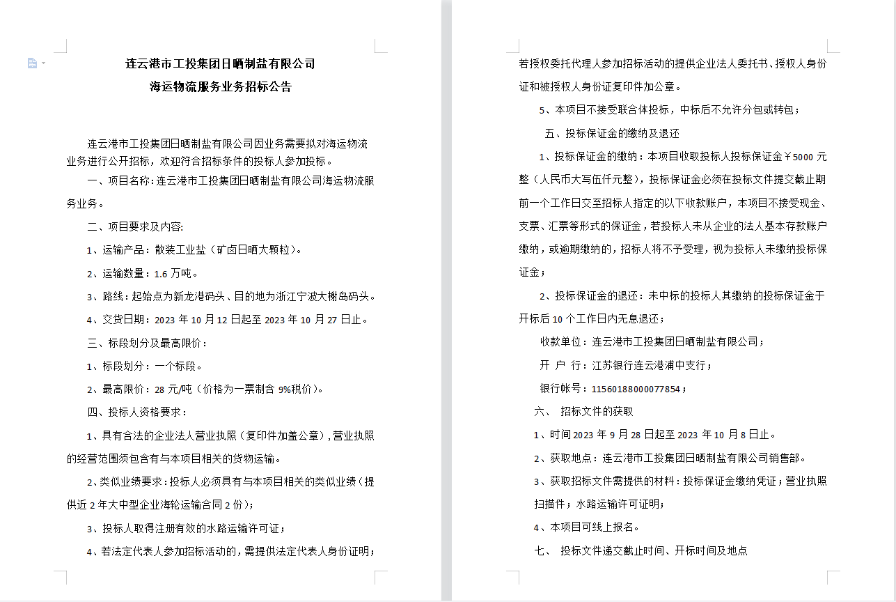 連云港市工投集團日曬制鹽有限公司海運物流服務業(yè)務招標公告
