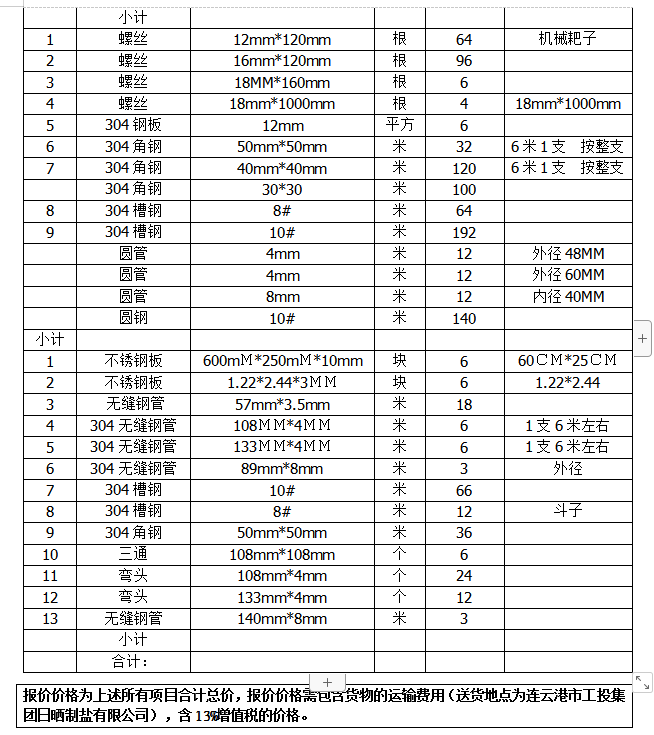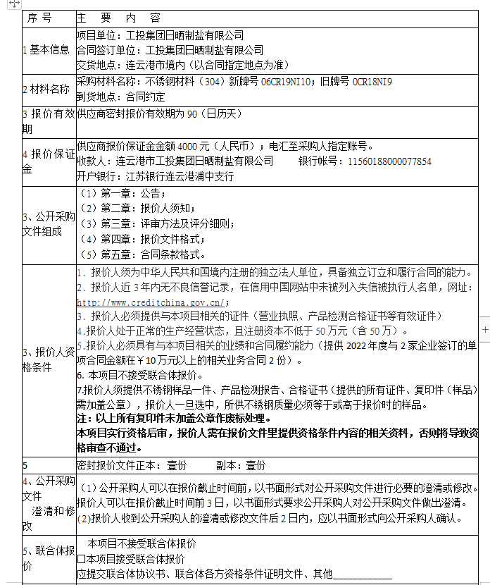 連云港市工投集團日曬制鹽有限公司不銹鋼(304)采購項目