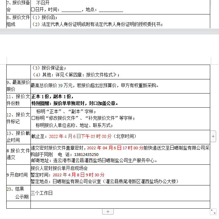 密封報價開啟時間及地點:2022048日前,如有特殊情況時間另行通知。