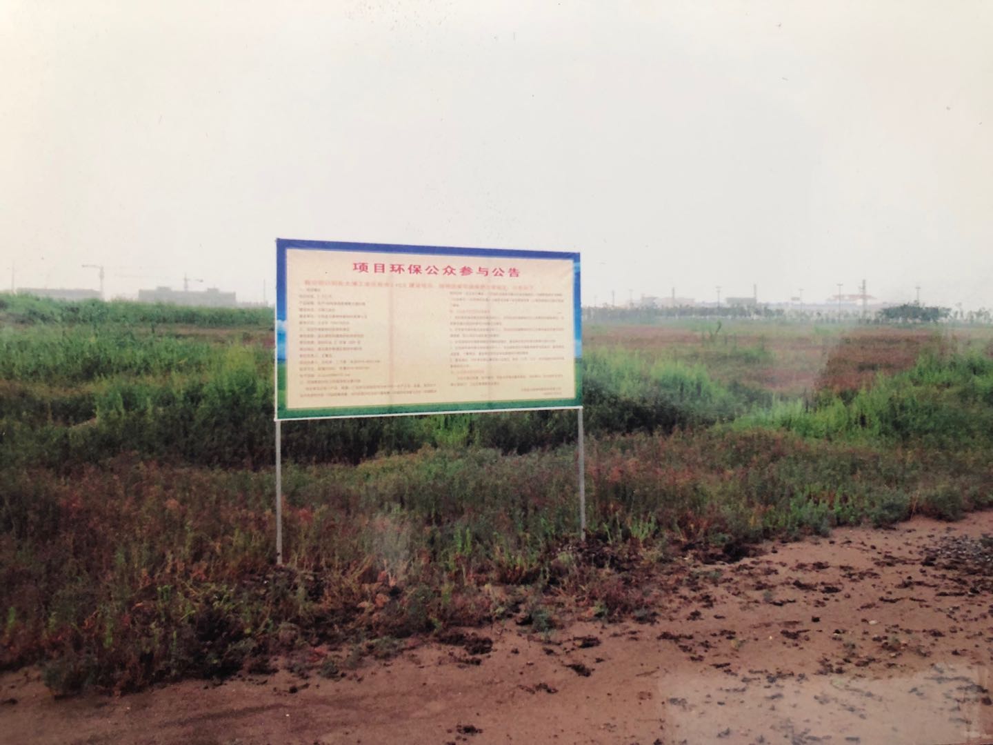 這是神特公司籌建時期的環評現場公示照片,是20088月底拍攝的。照片的重點部分是一個大牌子——項目環保公眾參與公告的牌子,位置大約在現在一期傳達室附近。做這樣的牌子是當時環評的一個環節,必須在建設場地進行兩次公告,征求相關環境利益方的訴求。牌子的遠方隱隱約約看見有些工廠和電力桿塔,牌子附近生長著茂密的堿蒿,一團團一簇簇,忽高忽低,可以看出地面是很不平整的。當年豎牌子的時候,是雨后不久,地面較為泥濘,建設用地及周邊環境多多少少透射出一種蒼涼的感覺。