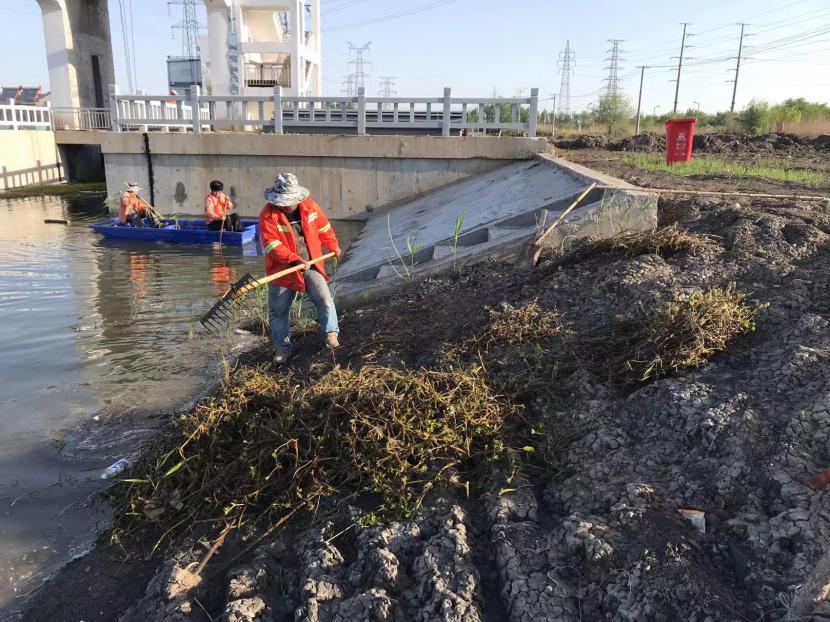 作業過程中,打撈人員因地制宜,采取分段清理、圍攔堵截、水上打撈等方式進行打撈,有的坐在船上用濾網、鉤耙等工具清理河面雜草,有的在岸邊將水草打撈上岸,并其進行集中處置,防止對河道造成二次污染。通過3個多小時的清理打撈,河道中的水流恢復暢通。