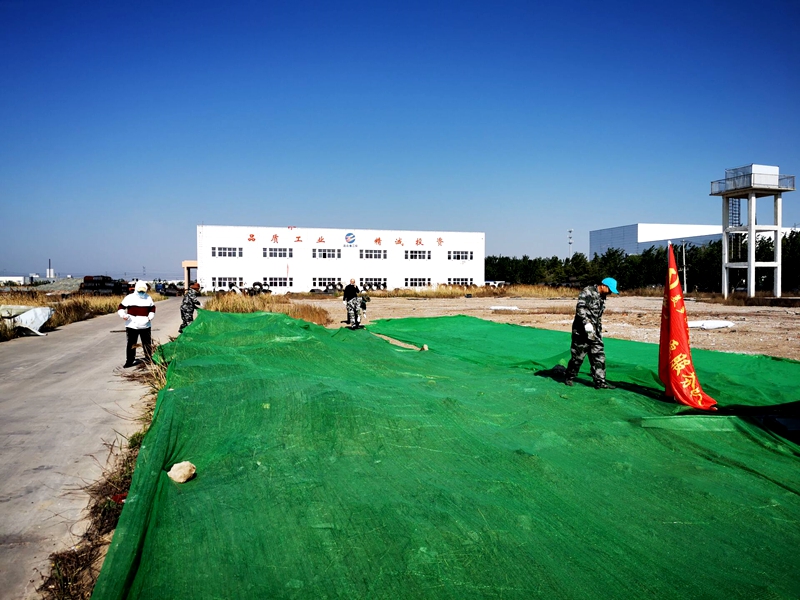 全體工作人員頂著烈日對黃土裸露區(qū)域進行覆蓋。大家分工明確,有條不紊,一邊清理廢棄垃圾,一邊小心謹(jǐn)慎的扯著防塵網(wǎng)布與迎面吹來的大風(fēng)沙土博弈。大家不怕臟、不怕累,個個奮勇爭先。經(jīng)過半天的辛苦勞動,就完成了近萬平方的露天黃土覆蓋工作。放眼望去,一片“綠草茵茵”,看似不可能完成的任務(wù)在大家的同心協(xié)力下順利完工,自豪和喜悅油然而生。
