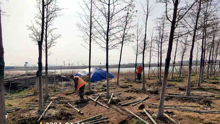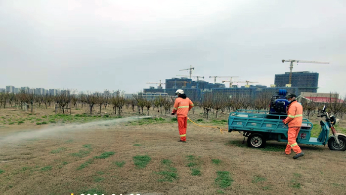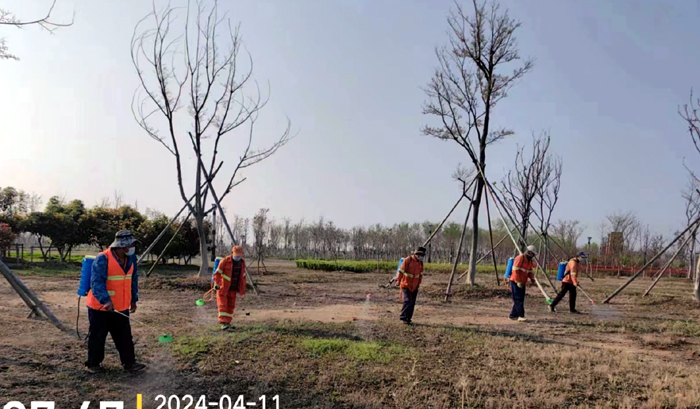 積極澆灌返青水。當前,地溫回升快,苗木易萌芽,該班組采用“人工+機械”相結合的方式,全面啟動返青水集中澆灌工作,重點對園區喬木、果木、草坪等進行全面灌溉,促進苗木、草坪返青發芽。按照分種類、合理澆灌的原則,采取集中澆灌的方式最大限度減緩晝夜溫差對綠化植物的影響,入春后共澆水100余次,對落羽杉圓動力灌根2000棵,對大樹澆水1500棵,綠化澆水約30000平方米。